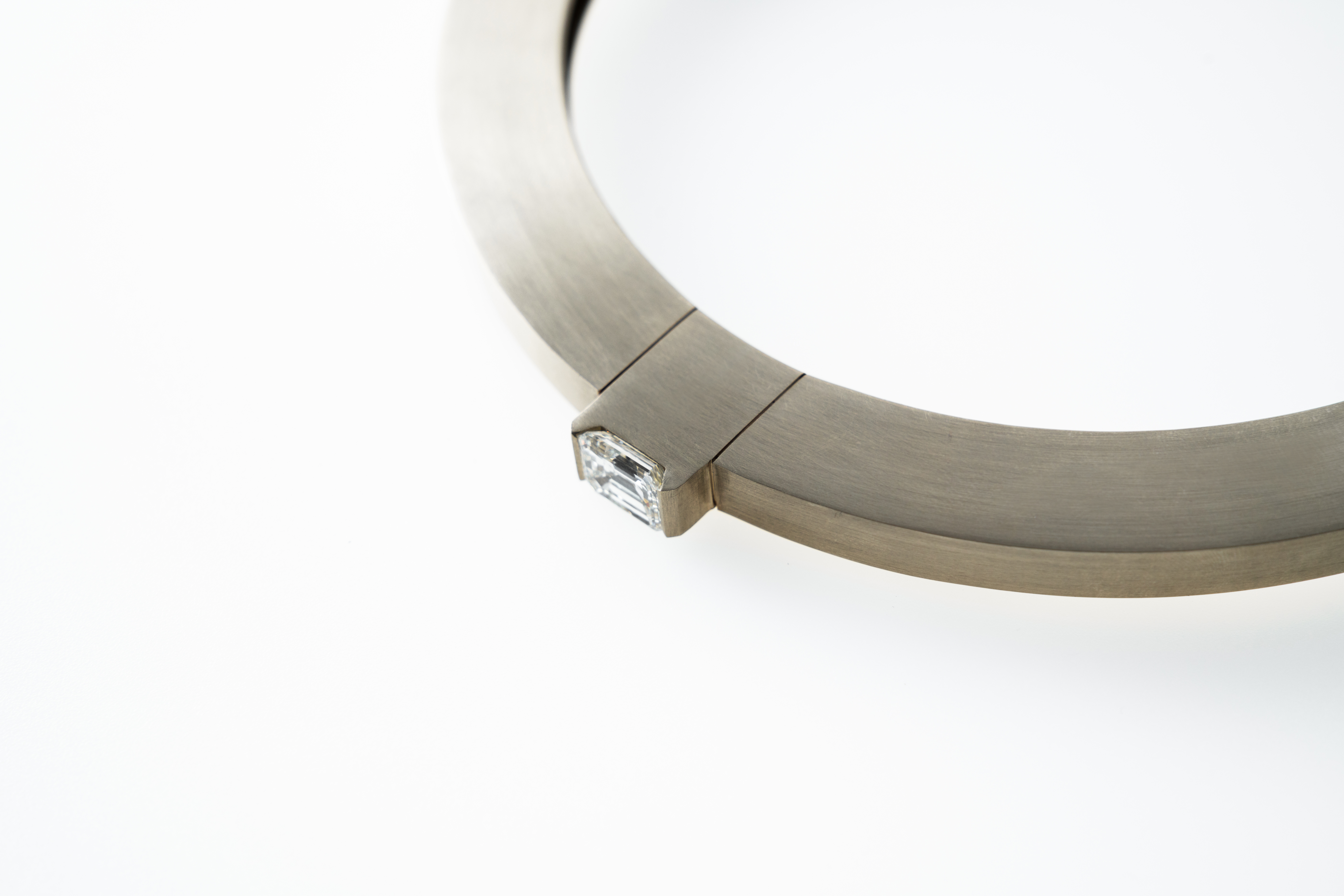 Handcrafted in 18K raw white (beige) brushed gold, with an emerald cut natural white diamond extended through the centre of the Torc.